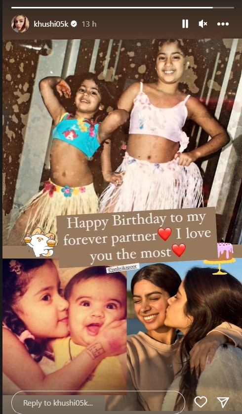 खुशी कपूर ने जाह्नवी के लिए अपने इंस्टाग्राम के स्टोरी सेक्शन में कुछ पुरानी तस्वीरों का एक कोलाज पोस्ट किया है। कोलाज में जाह्नवी और खुशी की बचपन से लेकर बड़े होने तक की खूबसूरत यादें देखने को मिल रही है।