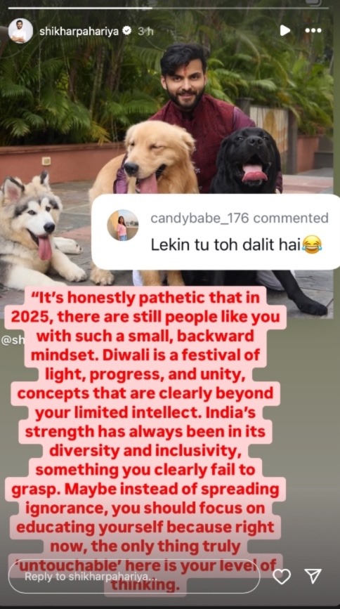 दरअसल शिखर पहाड़िया ने दिवाली पर पालतू कुत्तों के साथ फोटोज शेयर की थी। इन्हीं तस्वीरों पर एक ट्रोल ने कमेंट करते हुए लिखा, "लेकिन तू तो दलित है"। जहां ज्यादातर सेलेब्स ऐसी बातों को इग्नोर कर देते हैं। शिखर ने इस पर रिएक्ट करते हुए ट्रोलर्स की क्लास लगाई है। कमेंट का जवाब देते हुए शिखर सोशल मीडिया पर लिखा, "यह सच में काफी दुखद है कि 2025 में भी आप जैसे लोग ऐसी छोटी सोच और पिछड़ी मानसिकता वाले हैं।"