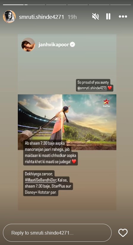 जाह्नवी ने इंस्टाग्राम स्टोरी पर एक शेयर की है। इसमें वह स्मृति संजय पहाड़िया (स्मृति शिंदे) को उनके नए टीवी शो 'माटी से बंधी डोर' के लिए बधाई देती नजर आ रही हैं। जाह्नवी ने लिखा 'आप पर गर्व है आंटी।'