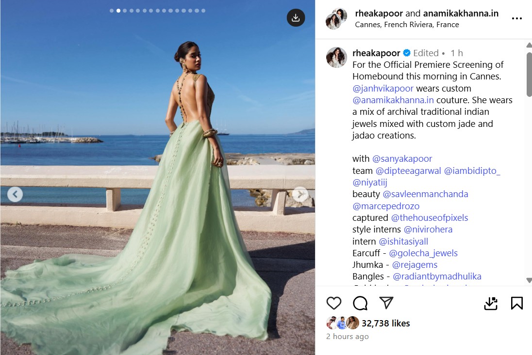 जान्हवी के लुक को तैयार करने वाली स्टाइलिस्ट रिया कपूर ने सोशल मीडिया पर कैप्शन के साथ कुछ बीटीएस तस्वीरें शेयर कीं,“आज सुबह कान्स में होमबाउंड की आधिकारिक प्रीमियर स्क्रीनिंग के लिए… जाह्नवी ने कस्टम जेड और जड़ाऊ कृतियों के साथ पुराने पारंपरिक भारतीय गहनों का मिश्रण पहना है।”