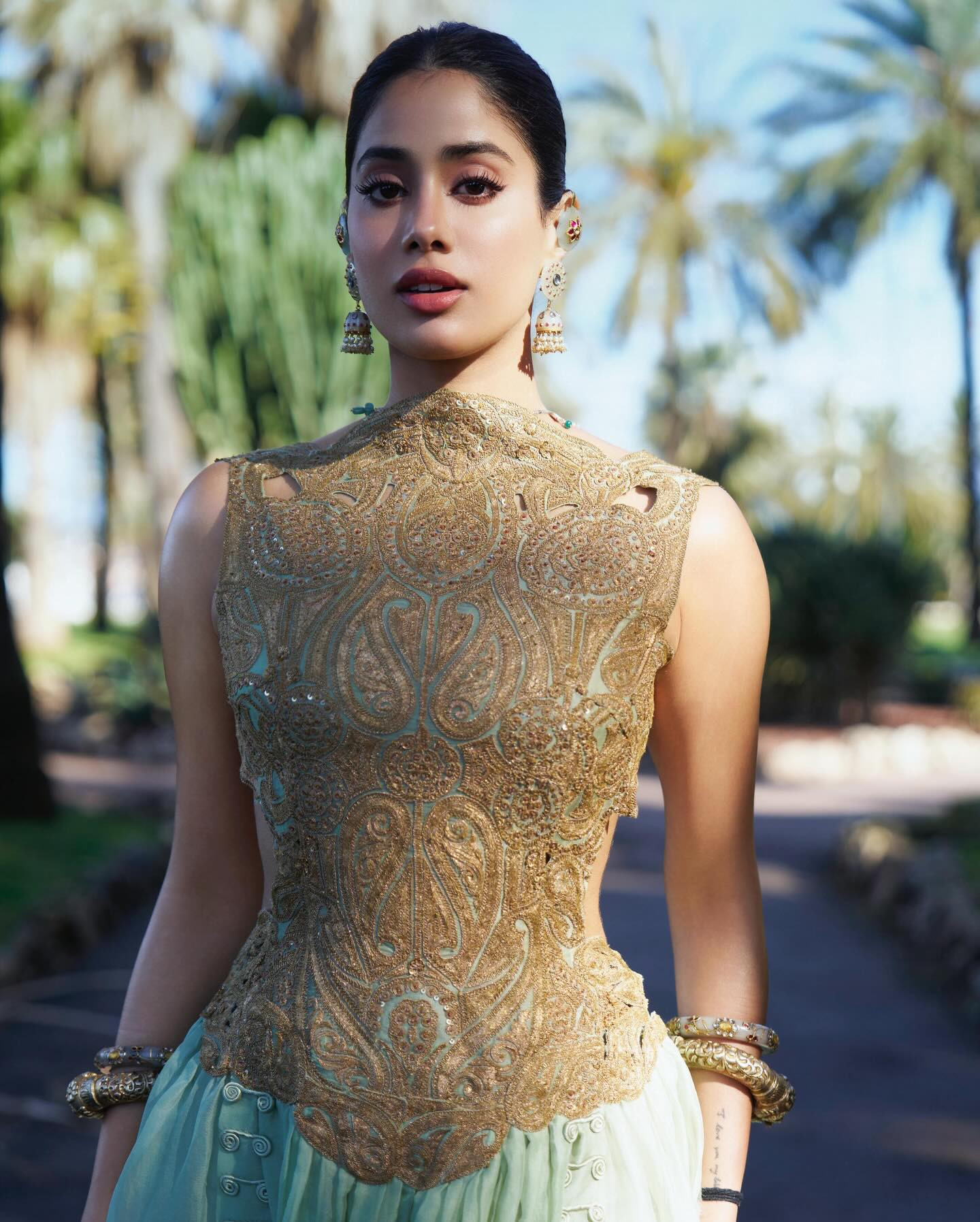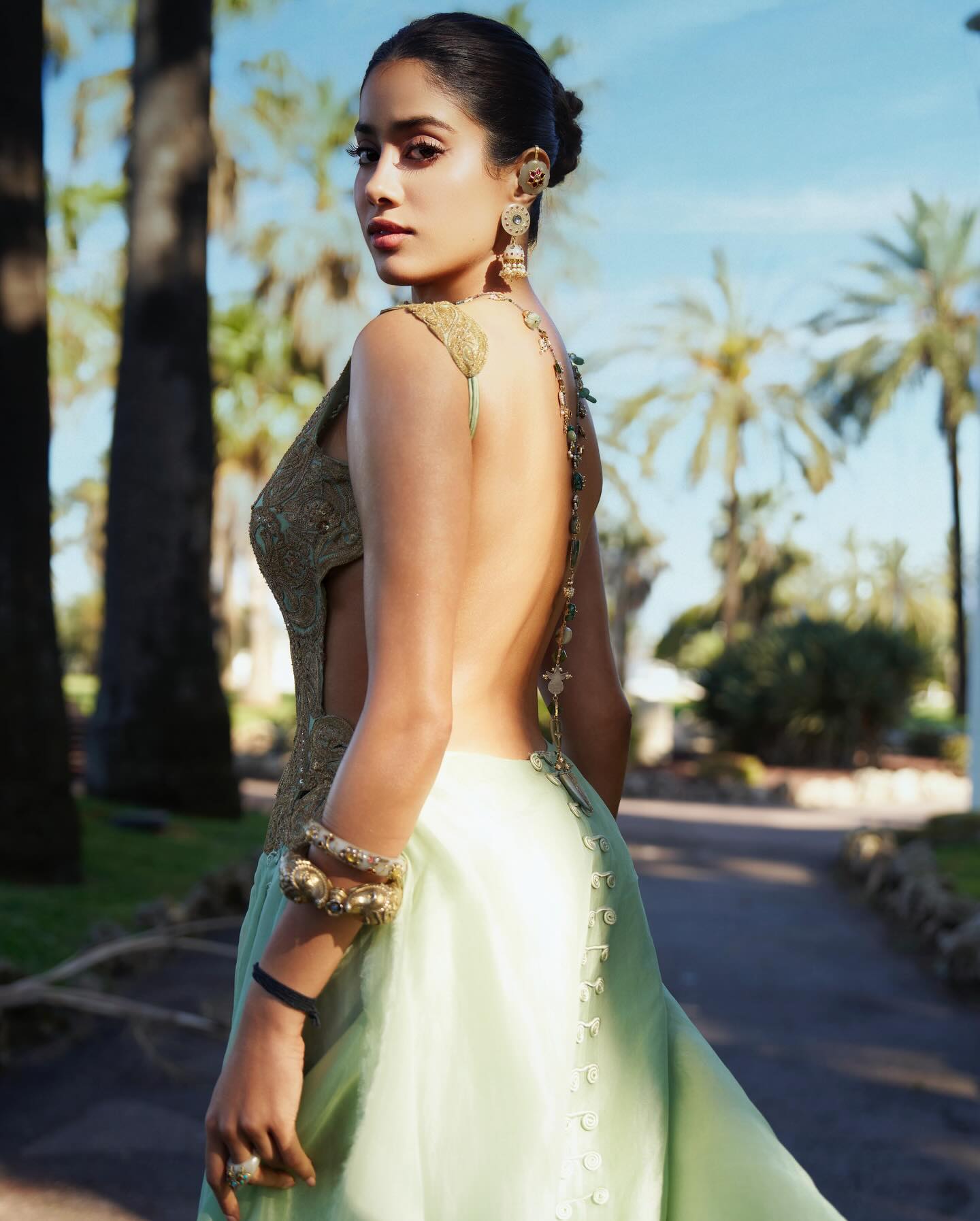 जाह्नवी के लुक को एक शाही टच देते हुए बैकलेस गाउन के साथ अर्काइवल जेड और जड़ाऊ ज्वेलरी को मिक्स किया गया। इस खूबसूरत कस्टम गाउन को डिजाइनर अनामिका खन्ना ने बनाया है। उनकी अनोखी बालियों ने उनके आकर्षण को और भी ज्यादा बढ़ा दिया था। जान्हवी ने विंटेज भारतीय आभूषणों का चुनाव बहुत ही सावधानी पूर्वक किया था। जड़ाऊ पीस से लेकर कस्टम जेड तत्वों तक, उनके एक्सेसरीज ने पूरे लुक को और भी एलीगेंट बना दिया।
