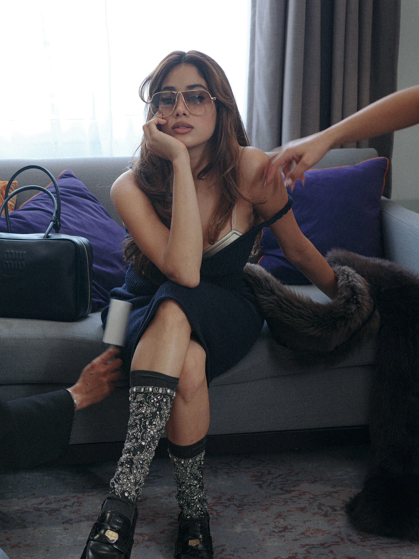 जाह्नवी ने अपने लुक को चमकदार नी-हाई सॉक्स, ब्लैक लोफर्स और ब्लैक बकेट हैट के साथ पूरा किया। इसके साथ ही एक फर स्टोल को कैजुअली ड्रेप किया, जो उनके लुक को विंटेज और मॉडर्न का परफेक्ट मिश्रण दे रहा था। सॉफ्ट ग्लैम मेकअप और खुले बालों के साथ जाह्नवी ने सीढ़ियों और होटल के बेड पर पोज़ दिए, जैसे वह इस स्पेस की मालकिन हों। यह सिर्फ एक आउटफिट नहीं, बल्कि एक मूड था—एफर्टलेस, एड्जी और पूरी तरह म्यू म्यू।
