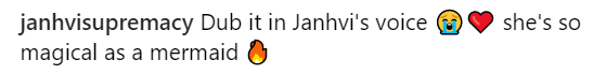 जाह्नवी को ‘जलपरी’ के रूप में देखकर लोग उनके कायल हो गए हैं। एक ने कहा, “जाह्नवी की वॉइस में इसका डब। वह जलपरी के रूप में बहुत मैजिकल लग रही हैं।” एक ने तो एक्ट्रेस को ‘द बेस्ट मरमेड’ भी कह दिया। एक अन्य ने कहा, “अति उत्तम।” एक और फैन ने कहा, “काश वह फ्यूचर में इस तरह के रोल करेंगी।’ लोगों को मरमेड लुक में जाह्नवी कपूर बहुत पसंद आ रही हैं।