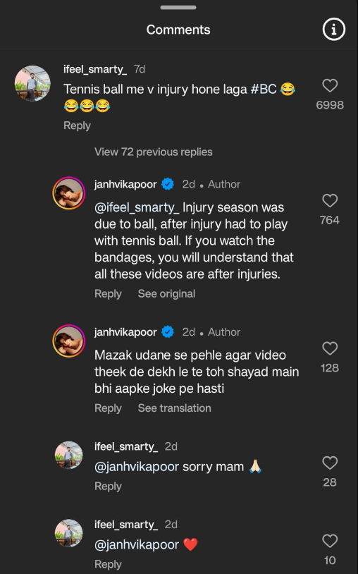 जाह्नवी ने आगे लिखा, "मजाक उड़ाने से पहले वीडियो ठीक से देख लेते तो शायद मैं भी आपके जोक पर हंसती. इसके बाद यूजर को अपनी गलती का एहसास होता है और वो कमेंट में हाथ जोड़कर उनसे माफी मांगता है।"