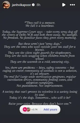 एक्ट्रेस जाह्नवी ने कोर्ट के फैसले पर नाराजगी जाहिर करते हुए इंस्टाग्राम स्टोरी पर एक अपील शेयर की। उन्होंने एक बयान पर सहमति जताई, जिसमें अदालत के फैसले को गलत बताया गया। इसमें लिखा हुआ था कि वे इसे खतरा मानते हैं और हम दिल की धड़कन मानते हैं। कोर्ट का कहना है कि दिल्ली-एनसीआर के अवारा कुत्तों को सड़कों से हटा दें। उन्हें बंद कर दो, जहां ना धूप हो और ना ही आजादी।'