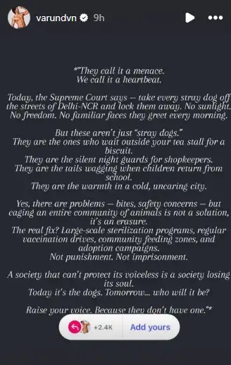 बॉलीवुड एक्टर वरुण धवन ने भी इंस्टाग्राम पर स्टोरी शेयर करते हुए सुप्रीम कोर्ट के फैसले पर नाराजगी जताई। वरुण के बारे में बता दें कि उनका नाम भी डॉग लवर्स सितारों की लिस्ट में शामिल किया जाता है। वह इससे पहले भी जानवरों के अधिकारों के बारे में बात कर चुके हैं और अब उन्होंने इस पिटीशन को इंस्टाग्राम स्टोरी पर शेयर किया है।
