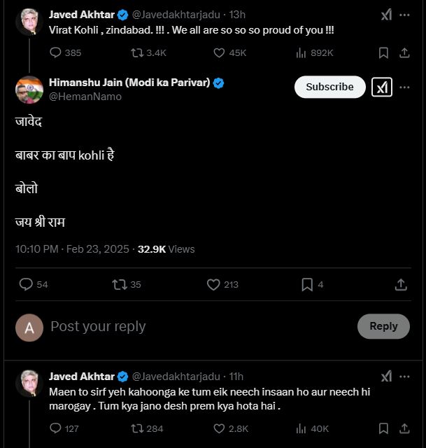 23 फरवरी की जीत को सेलिब्रेट करते हुए जावेद अख्तर ने अपने एक्स अकाउंट पर एक पोस्ट शेयर किया जिसमें उन्होंने लिखा, विराट कोहली, जिंदाबाद, हमें आप पर बहुत-बहुत गर्व है। इस पोस्ट पर एक यूजर ने रिएक्शन देते हुए लिखा, जावेद, बाबर का बाप कोहली है, बोलो जय श्री राम। यूजर की इस गंदी हरकत पर गीतकार काफी भड़क गए है और रिप्लाई देते हुए लिखते हैं, मैं तो सिर्फ यही कहूंगा कि तुम एक नीच इंसान हो और नीच ही मरोगे।