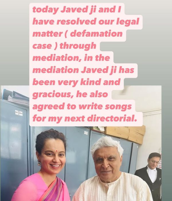 अभिनेत्री-सांसद कंगना रनौत और गीतकार जावेद अख्तर ने मानहानी के मामले को आपसी सहमत्ति के साथ सुलझाने का फैसला लिया था। कंगना ने कोर्ट से एक तस्वीर शेयर करते हुए बताया था कि अब उन दोनों के बीच के मतभेद खत्म हो चुके हैं और उन्होंने जावेद अख्तर से अपनी फिल्म के लिए गाना लिखने के लिए भी कहा है।