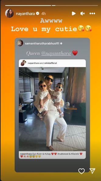 'कुशी' एक्ट्रेस सामंथा रुथ प्रभु ने भी इंस्टाग्राम पर लेडी सुपरस्टार नयनतारा का जोरदार स्वागत किया। उन्होंने इंस्टा स्टोरी पर नयनतारा का इंस्टाग्राम पेज शेयर करते हुए लिखा 'क्वीन नयनतारा', जिसके जवाब में साउथ एक्ट्रेस ने भी प्यार बरसाया और लिखा, "लव यू माय क्यूटीपाई"।