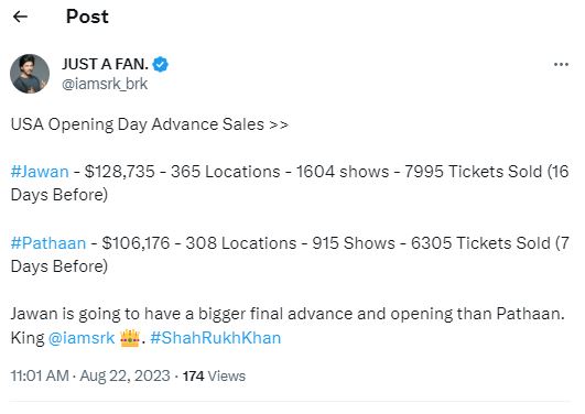USA में शाह रुख खान की फिल्म की एडवांस बुकिंग टिकट की बात करें तो 'जवान' की अब तक 7995 के करीब टिकट सोल्ड हो चुकी है, 365 लोकेशन पर, 1604 के करीब शोज 15 दिन पहले ही बुक हो चुके हैं।