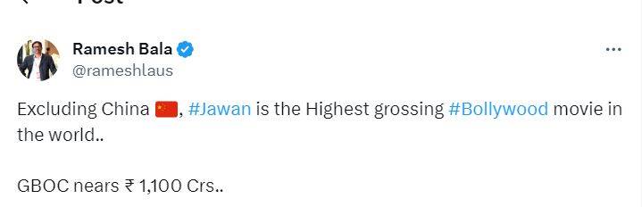 अब हाल ही में फिल्म क्रिटिक रमेश बाला ने अपने ऑफिशियल ट्विटर अकाउंट पर जानकारी शेयर करते हुए बताया कि 'जवान' इंडिया में सबसे ज्यादा कमाई करने वाली हिंदी फिल्म बन चुकी है। आपको बता दें कि 'जवान' का इंडिया में अब तक टोटल कलेक्शन 603 करोड़ तक पहुंचा है। वीकेंड पर इस फिल्म ने खुद को गिरने से बचा लिया है।
