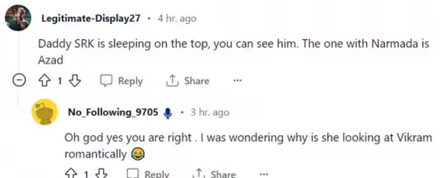 दूसरे यूजर ने लिखा, "ऐसा होता तो ये चार घंटे की फिल्म बन जाती। मुझे कोई दिक्कत नहीं है, मैं 4 घंटे भी ये फिल्म देख सकता हूं"। अन्य यूजर ने लिखा, "डैडी शाह रुख खान टॉप पर सो रहे हैं, जो आप देख सकते हैं, जिसमें वह नर्मदा आजाद के साथ हैं"।