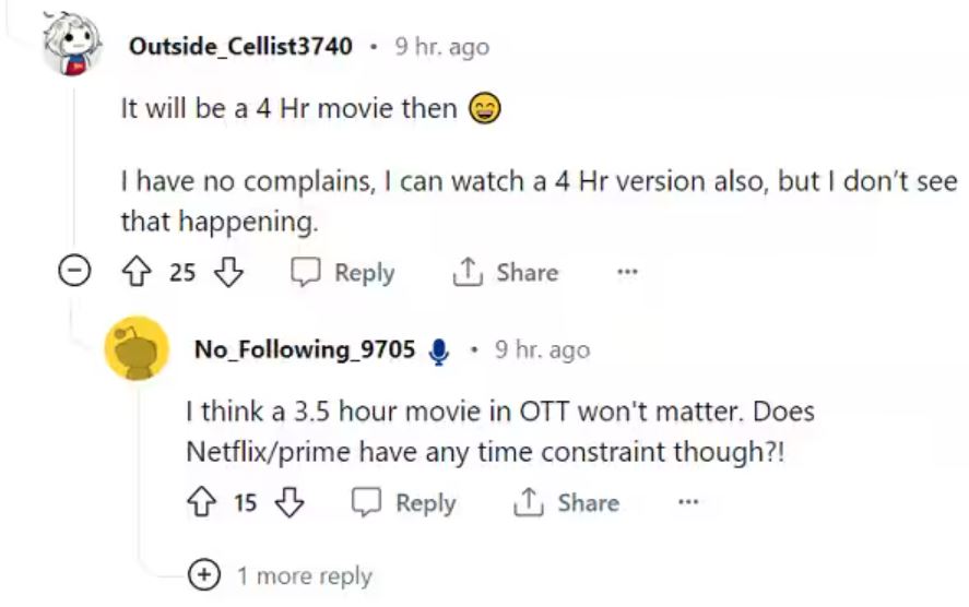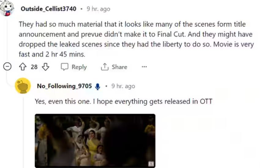 एक यूजर ने लिखा, "इनके पास इतना सारा मटेरियल था कि फिल्म का प्रीव्यू और टाइटल अनाउंस किया गया, उसके बाद फाइनल कट में से कई सीन्स हटाए गए। पौने तीन घंटे की ही फिल्म बहुत तेज है"।