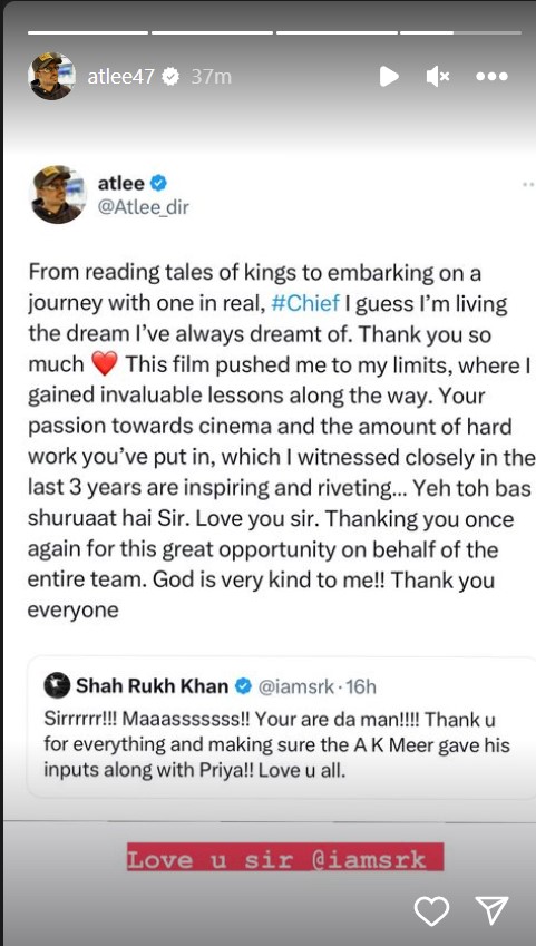 किंग खान से मिली तारीफ से गदगद एटली कुमार ने उनकी तारीफ में कुछ बातें लिखीं 'किंग (आपकी) की कहानियां जानने से लेकर आपके साथ रियल में काम करने तक, #Chief मुझे लगता है जो सपना मैंने हमेशा देखा, आज मैं उसे जी रहा हूं। बहुत-बहुत शुक्रिया। इस फिल्म ने बहुत कुछ सिखाया। सिनेमा को लेकर आपका पैशन, और जो मेहनत अपने काम के लिए आपने की, जिसे मैंने पिछले तीन साल में बहुत नजदीक से देखा, वह काबिलेतारीफ है...ये तो बस शुरुआत है सर। लव यू सर। पूरी टीम के तरफ आपको धन्यवाद करता हूं कि आपने मुझे यह मौका दिया। भगवान की मुझ पर कृपा है। सभी को शुक्रिया।'