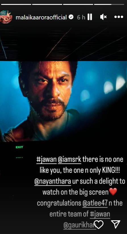 मलाइका अरोड़ा ने अपने सोशल मीडिया हैंडल इंस्टाग्राम पर 'जवान' की तारीफ करते हुए एक स्टोरी शेयर की है। इस स्टोरी को देख कर पता चल रहा है कि मलाइका थिएटर में इस फिल्म को देख रही हैं। एक्ट्रेस ने फिल्म में से शाह रुख की एक तस्वीर ली है और उस पर उनकी सरहाना करते हुए लिखा हैशटैग जवान शाह रुख आपके जैसा कोई नहीं, सिर्फ आप ही एक किंग हैं।