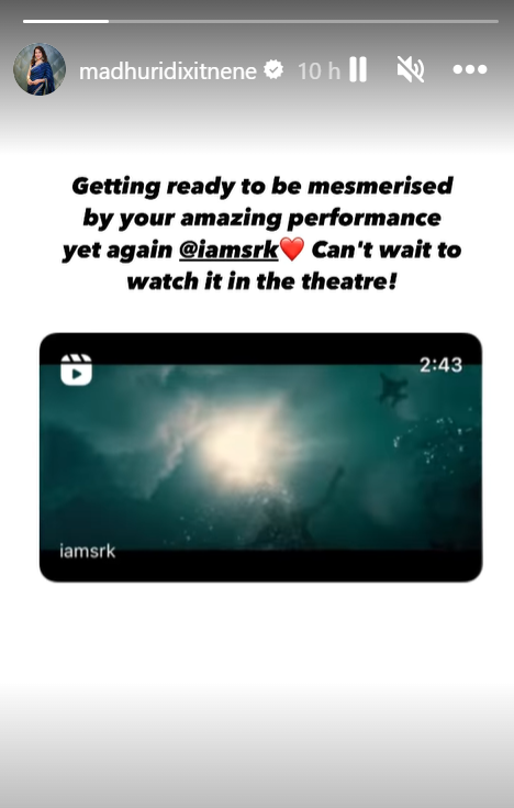 दरअसल, माधुरी दीक्षित ने अपनी इंस्टाग्राम स्टोरी पर जवान का ट्रेलर शेयर किया है। इसके साथ ही उन्होंने यह भी बताया कि वह 'जवान' को सिनेमाघर में देखने के लिए कितनी उत्साहित हैं। सिर्फ इतना ही नहीं माधुरी ने शाह रुख खान की भी जमकर तारीफ भी की।
