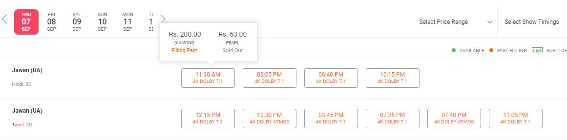 चेन्नई के एक मल्टीप्लेक्स में जवान का पहला शो 11 बजे करीब है और टिकट की कीमत 190 रुपए है। रात 10:45 का शो भी 190 से 200 रुपए के बीच में है। चेन्नई के एक अन्य थिएटर में शाह रुख खान के टिकट मात्र 63 में भी उपलब्ध है। यानी कि तमिल और तेलुगु भाषा में 'जवान' आराम से देख सकते हैं।