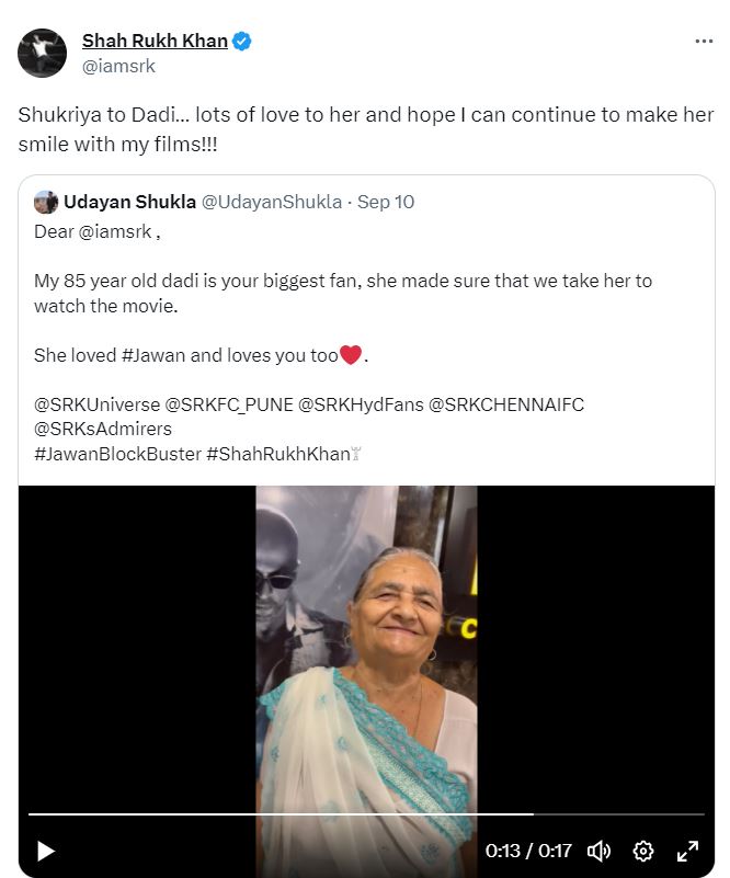 इसके साथ ही उन्होंने एक वीडियो भी डाला, जिसमें दादी कहती हैं कि, 'मैं जवान देखने आई हूं, तुम लोग मुझे लेकर नहीं आ रहे थे। लेकिन मैंने कहा मैं तो चलूंगी, क्योंकि शाह रुख खान की पिक्चर मुझे बहुत पसंद है। उनकी सब पिक्चर देखती हूं मैं और मुझे 'जवान' अच्छी लगी।