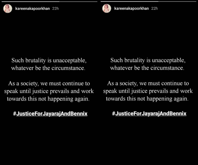 नई दिल्ली, जेएनएन। तमिलनाडु के तूतीकोरिन में पुलिस की ज्यादती के बाद पिता जयराज और बेटे फिनिक्स (Jayaraj And Bennix) की मौत का मामला अब तूल पकड़ता जा रहा है। लोगों में तो पुलिस की बर्बरता के खिलाफ गुस्सा है ही अब सेलेब्स का गुस्सा इस मामले पर फूटकर बाहर आ रहा है। बॉलीवुड एक्ट्रेस प्रियंका चोपाड़ा, तापसी पन्नू, जाहन्वी कपूर, टाइगर श्रॉफ की बहन कृष्णा श्रॉफ तो इस घटना पर अपना गुस्सा ज़ाहिर कर ही चुकी हैं। अब करीन कपूर खान भी इस मसले पर भड़की हैं। करीना ने अपनी इंस्टा स्टोरी पर एक पोस्ट लिखा है जिसमें उन्होंने इस घटना को अस्वीकार्य बताया है साथ ही न्याय की मांग की है।