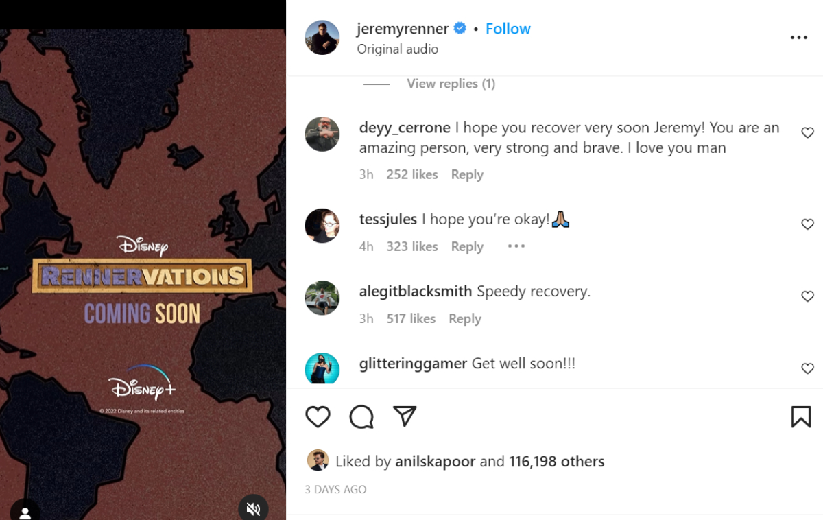 तीन दिनों पहले जेरेमी ने एक वीडियो पोस्ट किया था, जिस पर कमेंट करके फैंस उनके जल्द ठीक होने की दुआ कर रहे हैं। एक फैन ने लिखा- उम्मीद है कि आप जल्द ठीक होओगे, जेरेमी। आप जबरदस्त, मजबूत और बहादुर इंसान हैं। कई फैंस ने गेट वेल सून लिखा है।