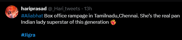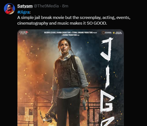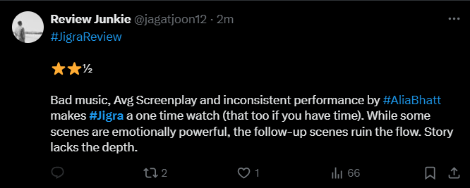 दूसरे यूजर ने लिखा, "खराब म्यूजिक, एवरेज स्क्रीनप्ले और आलिया भट्ट की परफॉर्मेंस बीच-बीच में धीमी है। आप सिर्फ जिगरा एक बार ही देख सकते हो। कुछ सीन जहां इमोशनली पावरफुल हैं, कहानी में गहराई की कमी है"।