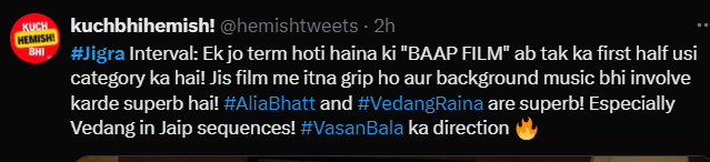 एक अन्य दर्शक ने इंटरवल तक फिल्म देखने के बाद लिखा, "एक जो टर्म होती है ना 'बाप फिल्म' अब तक का फर्स्ट हाफ उसी कैटेगरी का है। जिस फिल्म में इतना ग्रिप हो और बैकग्राउंड म्यूजिक भी इन्वोल्व कर दे, तो शानदार है। वेदांग रैना और आलिया भट्ट दोनों ने ही बहुत अच्छा काम किया है"।