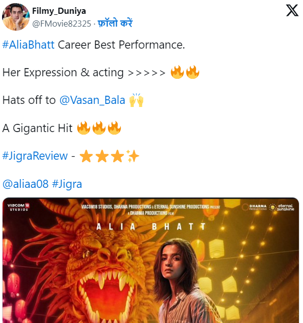 अब 'जिगरा' जब दर्शकों के हवाले हुई है, तो उन्होंने मूवी को दिल में जगह दी है या नहीं, उन्होंने बता दिया है। फिल्म देखकर निकले एक दर्शक ने एक्स अकाउंट पर लिखा, "ये आलिया भट्ट के करियर की सबसे बेस्ट परफॉर्मेंस है। उनके एक्सप्रेशन और एक्टिंग फायर है, वसन बाला हैट्स ऑफ"।