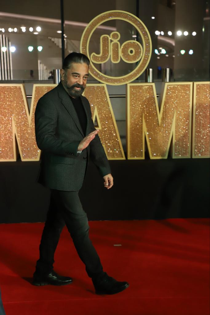 साउथ के सुपरस्टार कमल हासन जियो मामी फिल्म फेस्टिवल में ब्लैक सूट पहने कैमरा के सामने पोज देते नजर आए।