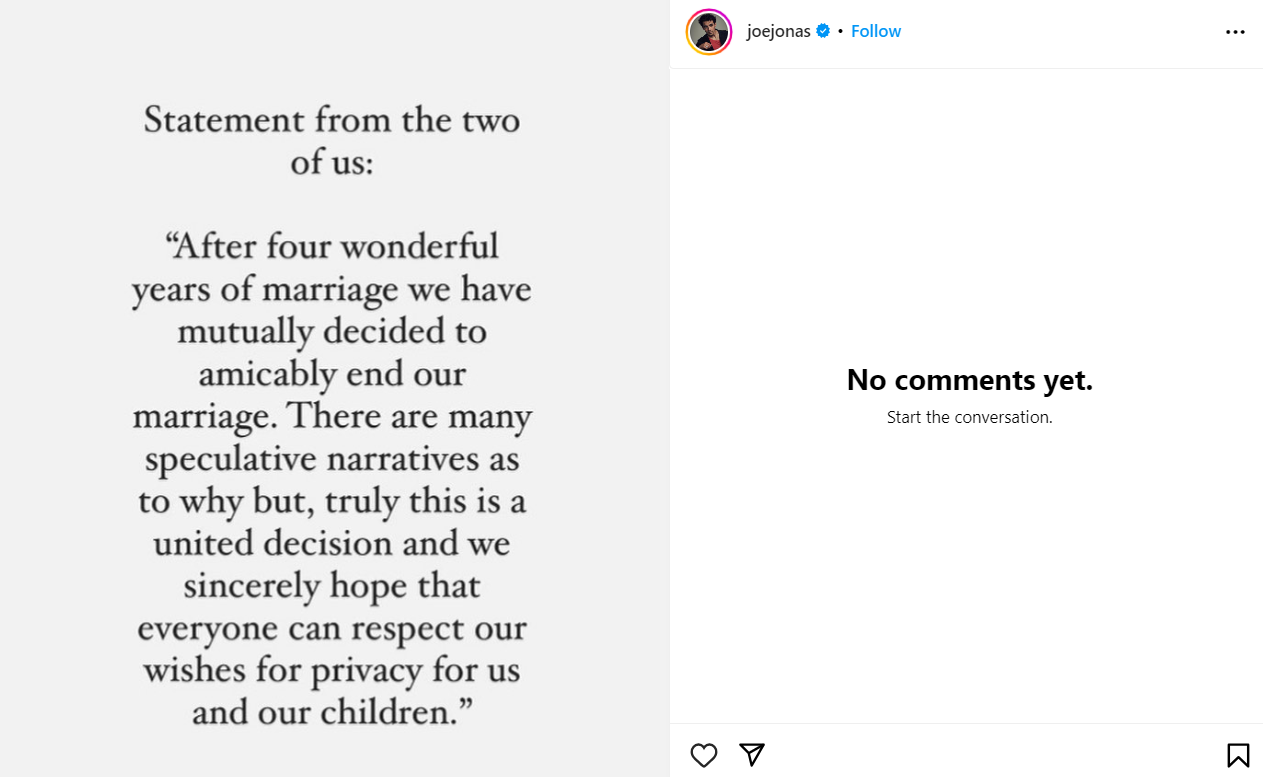 इसी बीच जो जोनस का भी एक वीडियो सामने आया, जिसमे वह अपने लाइफ के बीते हफ्ते का जिक्र करते हैं। वह कहते हैं, "यह एक कठिन सप्ताह रहा है। "मैं बस इतना कहना चाहता हूं, जो बातें आप लोगों ने खुद मेरे होठों से नहीं सुनी, तो इस पर विश्वास न करें। ठीक है? आपके प्यार और समर्थन के लिए आप सभी को धन्यवाद। मैं और मेरा परिवार आप लोगों से प्यार करता हैं।”