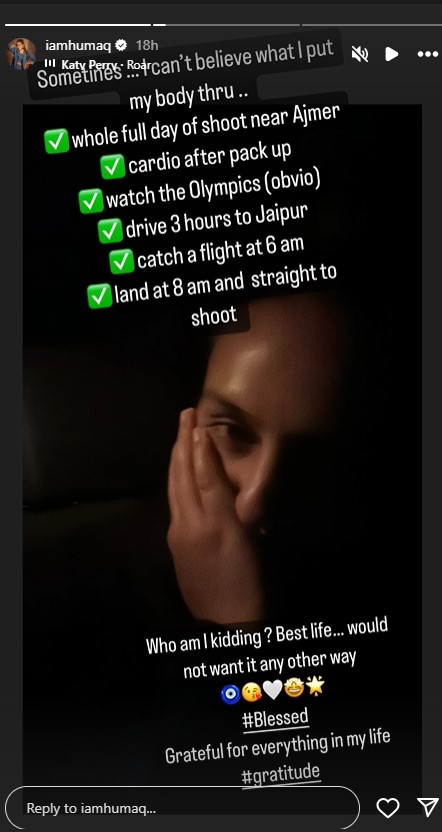 हुमा कुरैशी ने कैप्शन में कहा, "कभी-कभी तो मुझे यकीन ही नहीं होता कि मेरा शरीर मुझे कैसा सहता है... अजमेर के पास पूरा दिन शूटिंग, पैक अप के बाद कार्डियो, ओलंपिक देखना (जाहिर है), जयपुर के लिए तीन घंटे की ड्राइव, सुबह 6 बजे फ्लाइट पकड़ना, सुबह 8 बजे उतरना और सीधे शूटिंग पर जाना।" हालांकि, हुमा को इससे कोई ऐतराज नहीं है, क्योंकि उन्होंने इसे अपनी "बेहतरीन जिंदगी" बताया है। एक्ट्रेस ने आगे कहा, "मैं किससे मजाक कर रही हूं? बेहतरीन जिंदगी है... मैं इसे किसी और तरीके से नहीं चाहती हूं। मेरी जिंदगी में हर चीज के लिए आभारी हूं।"