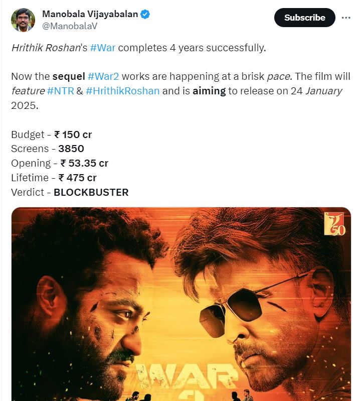 हाल ही में 2 अक्टूबर को वॉर की रिलीज को चार साल हो चुके हैं। इस मौके पर फिल्म क्रिटिक मनोबाला विजय बालन ने अपने आधिकारिक ट्विटर अकाउंट पर जानकारी शेयर करते हुए बताया कि मेकर्स 'वॉर 2' को 24 जनवरी 2025 में रिलीज करने का मन बना रहे हैं। हालांकि, मेकर्स की तरफ से 'वॉर 2' की रिलीज डेट पर कोई पुष्टि नहीं की गयी है।