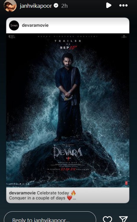 देवरा फिल्म 27 सितंबर को पैन इंडिया लेवल पर रिलीज हो रही है। वहीं, फिल्म का ट्रेलर मंगलवार 10 सितंबर को जारी किया जाएगा। हाल ही में फिल्म का गाना 'दाऊदी' रिलीज किया गया, जिसमें जाह्नवी कपूर की जूनियर एनटीआर के साथ केमस्ट्री काफी पसंद की गई।