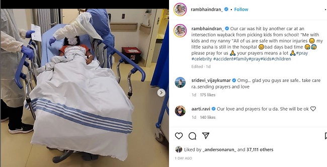 रंभा अपने बच्चों को लेकर स्कूल से घर लौट रही थी। उनके साथ उनके बच्चे भी थे। वहीं गाड़ी में बच्चों की आया भी बैठी थी। तभी उनकी गाड़ी का एक्सीडेंट हो गया। उनकी बेटी को कुछ समय के लिए अस्पताल में भर्ती कराया गया है।