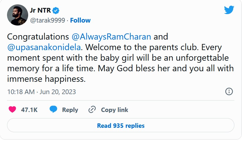 आरआरआर में राम चरण संग स्क्रीन शेयर कर चुके साउथ एक्टर जूनियर एनटीआर ने उन्हें पिता बनने पर बधाई दी है। एनटीआर ने ट्विटर पर राम चरण को बेटी के जन्म पर उन्हें और उनकी पत्नी उपासना को विश किया है। एनटीआर ने लिखा, 'बधाई हो राम चरण और उपासना कामिनेनी। माता-पिता क्लब में आपका स्वागत है। बच्ची के साथ बिताया हर पल जीवन भर के लिए अविस्मरणीय स्मृति बन जाएगा। ईश्वर बच्ची और आप सभी को अपार खुशियां प्रदान करें।'