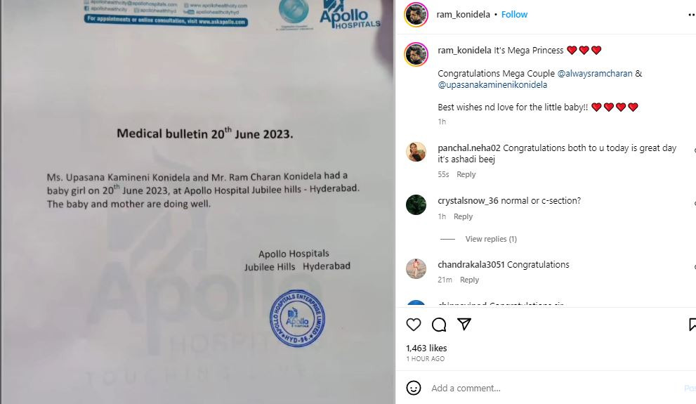आपको बात दें कि राम चरण और उपासना ने 14 जून, 2012 बड़े ही धूमधाम से शादी की थी। वहीं, अब शादी के 11 साल बाद उनके घर बेटी ने जन्म लिया है। सोशल मीडिया पर एक पोस्ट वायरल हो रहा है। इसमें लिखा है, 'मिस उपासना कामिनेनी और मिस्टर राम चरण की बेबी गर्ल का जन्म 20 जून 2023 को अपोलो हॉस्पिटल जुबली हिल्स-हैदराबाद में हुआ है। बेबी और मां दोनों बिल्कुल सुरक्षित हैं।' इसी के बाद से ही फैंस की खुशी का ठिकाना नहीं रहा।