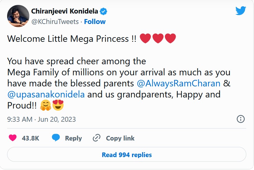 साउथ सुपरस्टार चिरंजीवी दादा बनते ही खुशी से झूम उठे हैं। बेटे के पिता बनने पर और घर में बेटी के रूप में खुशियां आने पर उन्हें खास मैसेज शेयर किया है। उन्होंने ट्विटर पर लिखा, 'आपका स्वागत है छोटी मेगा राजकुमारी। आपने लोगों के बीच खुशियां बिखेर दी हैं। आपके आगमन पर राम चरण और उपासना धन्य माता-पिता बन गए हैं और हम दादा-दादी खुश और गौरवान्वित।' इसके अलावा फैंस भी स्टार्स को ढेरों बधाई दे रहे हैं।