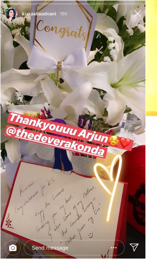 'Arjun Reddy' बने Vijay Deverakonda ने कियारा को लिखा हैं,’कबीर सिंह के लिए बधाई कियारा, सफलता का आनंद लो, तुम्हें शुभकामनाएं देने के अलावा अपने कपड़े भेज रहा हूंl यह गलत सुनाई दे रहा हैंl मैं तुम्हें मेरे ब्रांड के कपड़े भेज रहा हूंl’ इसपर कियारा अडवाणी ने Vijay Deverakonda को बधाई देते हुए लिखा हैं,'आभारी हूं अर्जुनl’