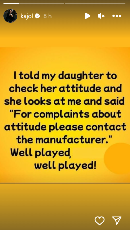 एक्ट्रेस काजोल ने अपने सोशल मीडिया हैंडल इंस्टाग्राम पर एक पोस्ट शेयर किया है। इस पोस्ट में उन्होंने बताया है कि जब उन्होंने अपनी बेटी को एटीट्यूड ठीक करने की सलाह दी, तो नीसा ने उन्हें क्या जवाब दिया। स्टोरी शेयर करते हुए एक्ट्रेस ने लिखा 'मैंने जब अपनी बेटी से कहा कि वह अपने एटीट्यूड को ठीक करे, तो उसने मेरी तरफ देखा और कहा, 'एटीट्यूड के बारे में शिकायतों के लिए कृपया निर्माता से संपर्क करें। अच्छा खेला, अच्छा खेला'।