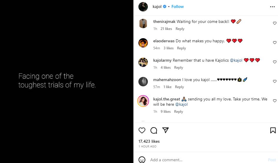 काजोल ने कुछ समय पहले ही अपने इंस्टाग्राम और ट्विटर पर अपने फैंस को ये बताया कि वह कुछ समय के लिए सोशल मीडिया से ब्रेक ले रही हैं। उन्होंने ट्विटर पर एक पोस्ट शेयर की जिसमें उन्होंने लिखा, 'मैं अपने जिंदगी के सबसे मुश्किल ट्रायल को फेस कर रही हूं'।