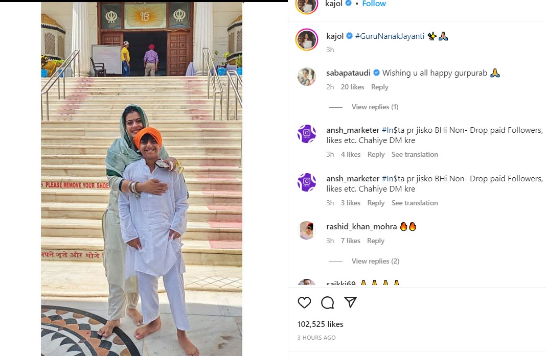 गुरु नानक जयंती पर काजोल ने युग के साथ फोटो शेयर की है। यह तस्वीर गुरुद्वारे के बाहर ली गई है। इस तस्वीर के जरिये काजोल ने अपने सभी फैंस को गुरु नानक जयंती की शुभकामनाएं दी हैं। मां-बेटे की यह जोड़ी फैंस को काउफी पसंद आ रही है। इसी तस्वीर को बेटी नीसा ने भी शेयर करते हुए गुरु नानक जयंती की बधाई दी है।