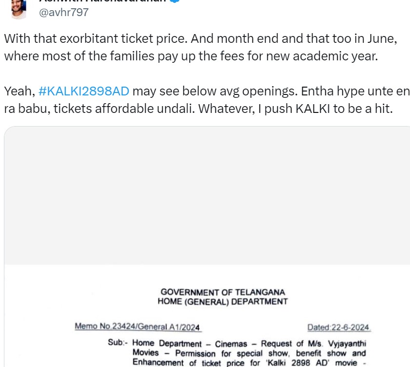 फिल्म के तेलंगाना राज्य में बढ़ते प्राइस को देख कुछ यूजर्स ने नाराजगी जताई है। एक ने लिखा, 'मंथ एंड में और जून में, ऐसे वक्त में जब न्यू एकेडमिक ईयर शुरू होता है और लोगों को फीस भरनी होती है, तब इस फिल्म का प्राइस बढ़ा है। कल्कि 2898 एडी एवरेज से भी कम में शुरुआत ले सकता है।'