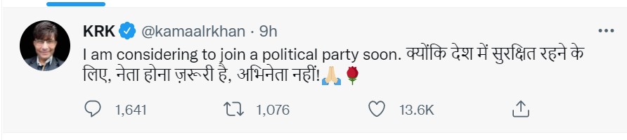 केआरके ने कहा, 'मैं पॉलिटिकल पार्टी ज्वाइन करने के बारे में सोच रहा हूं। क्योंकि देश में सुरक्षित रहने के लिए, नेता होना जरूरी है, अभिनेता नहीं!