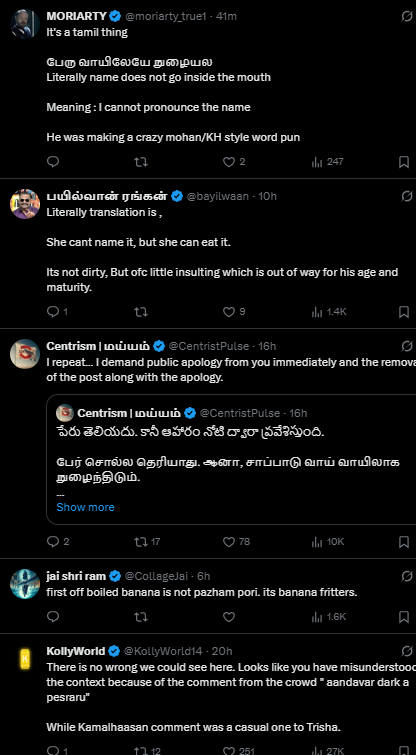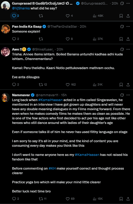 एक और अन्य यूजर ने लिखा, "कमल हासन अकेले ऐसे एक्टर हैं, जिन्होंने एक बार ये बोला था मेरी खुद की दो बेटियां हैं और मैं कभी कोई ऐसी फिल्में नहीं करूंगा जिसमें डबल मीनिंग वाली बातें हो, ये केवल आपकी सोच है"।