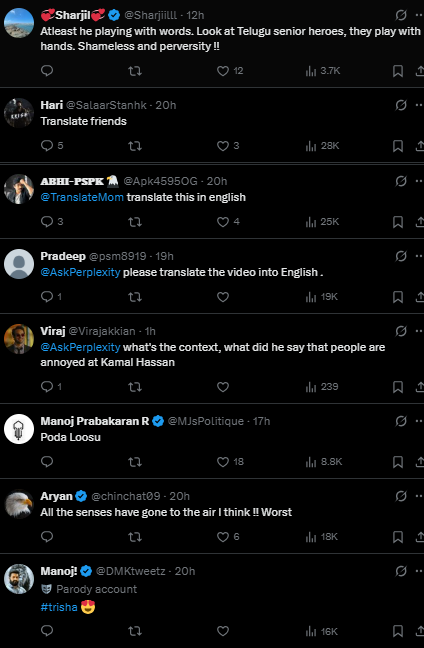तृषा की इस बात को बीच में ही काटते हुए कमल हासन ने तपाक से जवाब में कहा, "इसे उसका नाम नहीं पता है, लेकिन ये उसे मुंह में रखती हैं"। तृषा अभिनेता की ये बात सुनकर हंस पड़ीं। उनका ये वीडियो आग की तरह वायरल हो गया, जिसके बाद सोशल मीडिया यूजर्स दो गुटों में बंट गए।
