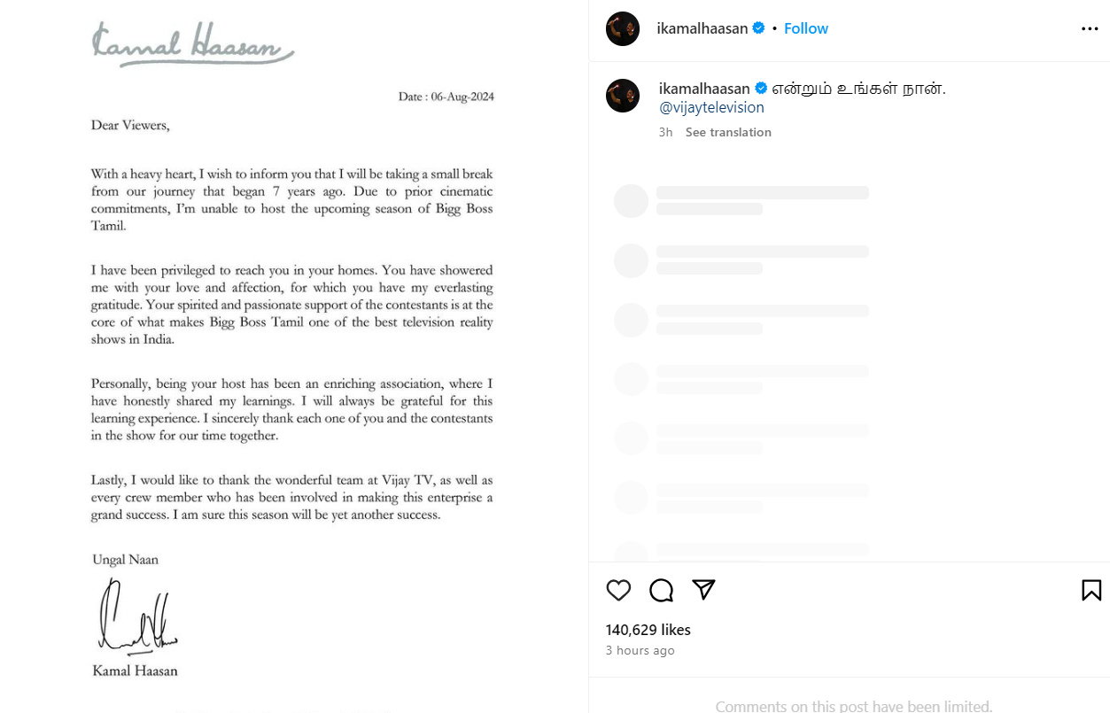 Kamal Haasan नहीं करेंगे 'बिग बॉस तमिल' सीजन 8 को होस्ट, पोस्ट शेयर कर बताई वजह