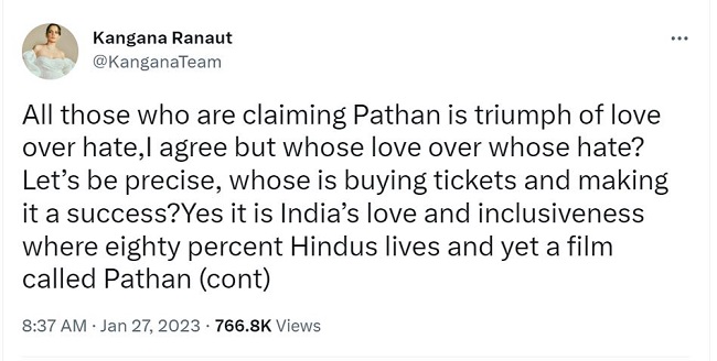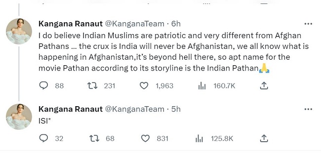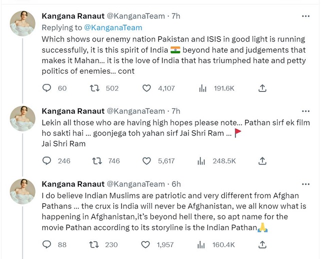 एक अन्य ट्वीट में कंगना रनोट ने कहा, 'अगर पठान की सफलता लेफ्ट विंग पॉलिटिक्स की जीत है जो कि कांग्रेस पार्टी से जुड़ी हुई है तो फिर फिल्म इंडस्ट्री राइट आईडियोलॉजी की उपेक्षा क्यों कर रही है।' शाह रुख खान की फिल्म पठान में दीपिका पादुकोण और जॉन अब्राहम भी है। यह फिल्म 25 जनवरी को रिलीज हुई है। फिल्म को बायकॉट करने की भी मांग की गई थी। इस बीच फिल्म को अच्छी ओपनिंग मिली है।