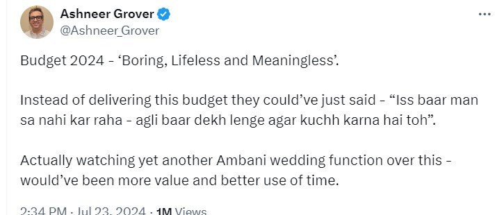 शार्क टैंक इंडिया के जज रह चुके अशनीर ग्रोवर ने बजट को बोरिंग बताया है। उन्होंने कहा कि ये बजट मीनिंगलेस है। इस बार ऐसा बजट पेश करने से बेहतर था कि ये कह देते- इस बार मन से नहीं कर रहा- अगली बार देख लेंगे अगर कुछ करना है तो। बल्कि मैं इसकी जगह एक और अंबानी फंक्शन को देख रहा हूं- ये ज्यादा महत्वपूर्ण और समय का सदुपयोग होगा।''