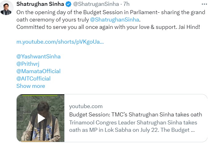 आसनसोल से सांसद शत्रुग्न सिन्हा (Shatrughan Sinha) ने भी बजट में भाषण देने के दौरान का ट्वीट और वीडियो शेयर किया।