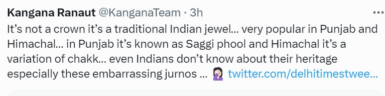 Kangana Ranaut Latest Tweet फिल्मी दुनिया में अपना दमखम दिखा रहीं बॉलीवुड की क्वीन कंगना रनोट हर मुद्दों पर खुलकर बोलती हैं। हाल ही में एक्ट्रेस के हेडपीस को ताज कह दिया गया तो वह बुरी तरह भड़क गई।