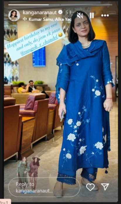 बी टाउन एक्ट्रेस कंगना रनौत के सोशल मीडिया अकाउंट को देखकर परिवार के प्रति उनके प्रेम का अंदाजा लगाया जा सकता है। अभिनेत्री अक्सर अपनी फैमिली के साथ टाइम स्पेंड करने की पोस्ट शेयर करती रहती हैं। इस बार उन्होंने बहन रंगोली को जन्मदिन की बधाई देते हुए लिखा, ‘बर्थडे की बधाई मेरी इकलौती बहन हम दो जिस्म एक जान हैं।’ कंगना का यह बयान दोनों के बीच के प्रेम को दर्शाता है।